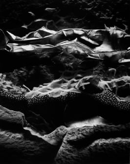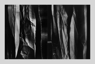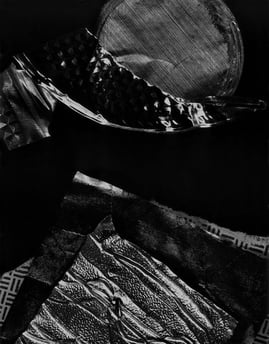 "Chiarenza's images are rife with stark chiaroscuro and a rich scale of silvers set against a void, hinting at moonscapes or landscapes painted by moonlight. What the artist accomplishes by catching light in the crinkles and folds of layered cast-off materials is astounding."